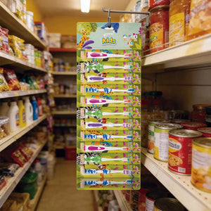 Cepillo dental para niños y niñas con cerdas suaves y diseño ergonómico. Ristra x12 unidades con desprendimiento fácil. Ideal para papelerías, tiendas TAT y kits escolares.